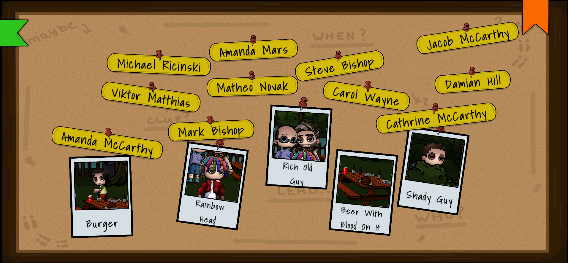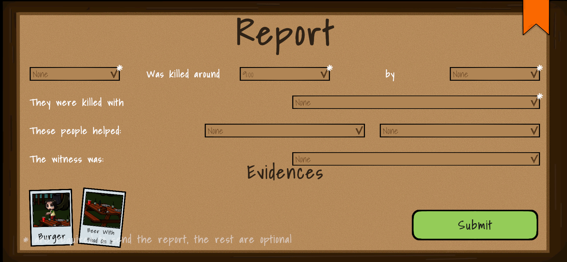 Use your coarkboard to sort clues and fill a crime raport to finish the game.